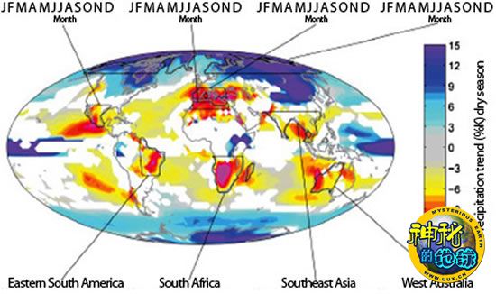 作为这种中和作用的一个后果,几乎所有在2100年能够看到的升温迹象——大约1.5摄氏度到4摄氏度,这取决于最终排放的二氧化碳气体数量——将一直持续到3000年。Solomon表示:“气候系统随时间的变化是非常缓慢的,人们有足够的时间来‘欣赏’气候变化持续的过程到底有多长。”Solomon和同事指出,与持续高温相伴的将是一系列的气候变化,但他们特别强调了一种变化——干旱。即便全球温度“适当地”上升2摄氏度,北美洲西南部、南美洲东部以及非洲南部在夏季都将面临严重的干旱,其程度堪比上世纪30年代美国遭受的尘暴所导致的干旱,只不过后者持续的时间仅仅为10到20年,而前者可能会持续几个世纪。更糟糕的是,非洲北部、欧洲南部以及澳洲西部有可能会经历两次这样的灾难。