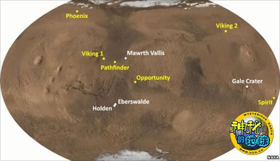 4个登陆点的复选名单和火星上的登陆器及火星车位置。