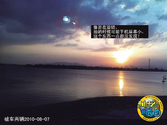 诡异的事就发生在小夫妻俩回家后。王秦把照片上传到电脑上一看,发现其中的5张照片里都有个不明飞行物!就在夕阳的左上方,是个圆圆的、亮亮的东西,周边有一圈幽幽的蓝光,似乎还在不停地自转。其中一张他老婆给他拍的照片,还成了他和那个不明飞行物的合影。看来看去,他认为肯定不是星星,比星星要大得多、亮得多;也不像是夜光风筝,因为它看上去比较立体、饱满……“我怀疑这个就是UFO!”