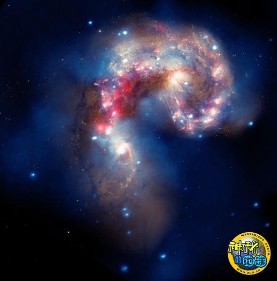 据美国宇航局太空网报道,美国宇航局最近利用不同的太空望远镜收集的数据制成的一张两星系相撞的合成图,其壮观的场面显示了宇宙这一区域存在大量恒星活动。这次宇宙撞击事件开始于1亿多年前,不过现在仍在继续,它导致这两个星系的尘埃、气体云团里形成数百万颗恒星。
