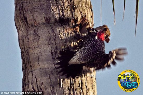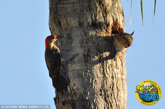 红腹啄木鸟发出叫声示意松鼠马上离开它的巢穴