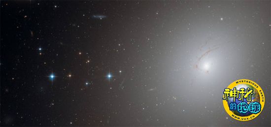 这个编号为NGC 4696的星系,是其他同类椭圆星系中的一个异类。椭圆星系一般是圆形,看起来始终像个光球,没有像螺旋星系一样的独特臂状物和颜色。大部分看起来像是由螺旋星系相撞在一起形成的,椭圆星系里的星际尘埃和气体彼此相撞,形成恒星时,会出现短暂的爆炸现象。这一过程会很快耗尽年轻椭圆星系的能量,使它再也没有多余气体供新恒星形成。最终这些星系逐渐变老,慢慢变得越来越昏暗。