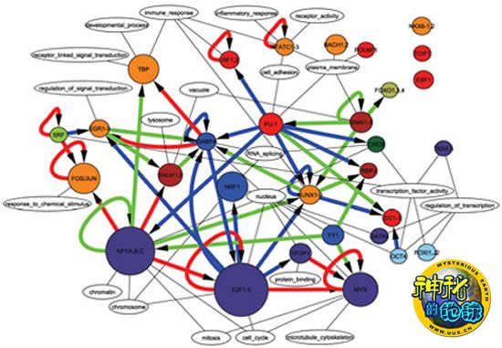 通过用新的软件对这些海量的数据进行筛选,FANTOM研究小组梳理出了重要的角色,以及它们之间的关系。这项研究的第一个目标便是与THP-1细胞——在实验室实验中使用的一种人类白血病细胞系——的分化控制有关的调节网络。研究小组在基因组中鉴别出29857个能够对蛋白质调节作出响应的区域,并在分化过程中追踪了其中6例的活性水平。