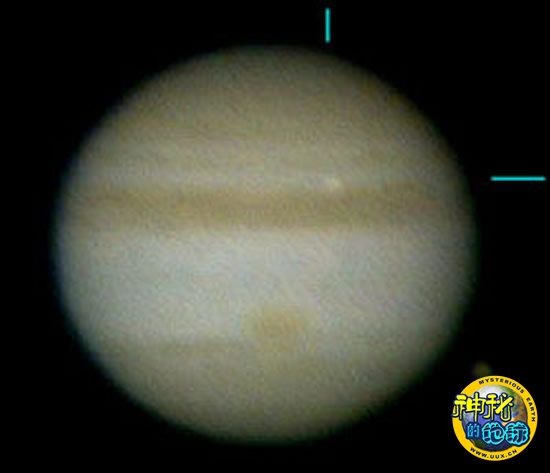 2010年8月20日格林尼治标准时18:22,一位日本观测者立川雅之使用一台15厘米口径反射式望远镜记录到木星表面一次短暂的闪光。在这张图像中,上部方向为北,中部下方是有名的木星“大红斑”,紧靠木星圆面右侧是木卫三