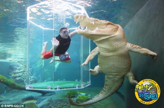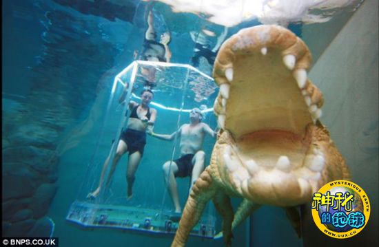 格雷格里接着说,“我们的一位主管对鳄鱼的管理很有经验,他提出了一个想法,就是允许人们在一个安全的环境中与这些食物链顶端的物种近距离相遇。这个有机玻璃箱运行于一个悬挂单轨系统上,悬挂于围栏上方。在水下的20分钟内,这个有机玻璃箱则分别被下沉到四个独立的围栏中。有机玻璃厚度达13厘米,在制造过程中已经过严格的性能测试,在测试组进入有机玻璃箱中之前,还要测试鳄鱼对有机玻璃箱的反应以及有机玻璃箱的安全性。在有机玻璃箱的顶部,有两个门,可以防止任何事物进入箱中。此外,还有一个备用马达和独立的索链,以保证万一出现机械故障时,有机玻璃箱仍可继续运行。箱子通常只能沉入到水面之下大约2英尺(约合0.6米)。当然,如果游客不会游泳或愿意将头露出水面的话,这个深度也可以调整。”