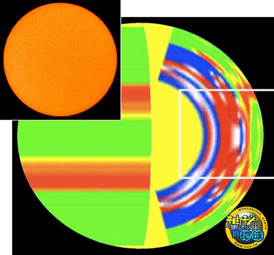 太阳射流(红色,右侧)到达它们的临界位置,随后新的太阳活动周期的第一个黑子将破坏恒星表面现在的平静景象(小图)。