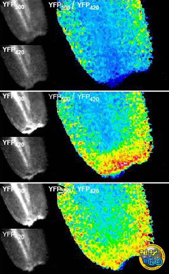 一条小斑马鱼的尾部在被割破后3分钟、17分钟和61分钟(由上至下)的图像,从中可以看到,过氧化氢从伤口释放,并随着向组织的扩散而不断褪色。