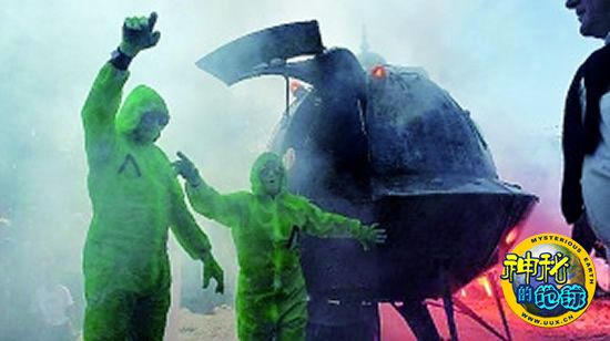 为了给“害羞”的外星人作出示范,当地人举办了一场模拟“第三类接触”仪式:一架由当地艺术家设计制造的“飞碟”降落在UFO机场,当舱门打开,化妆成外星小绿人的表演者走下舷梯,踏上地球土地,成为34年来这里的首批“外星来客”。