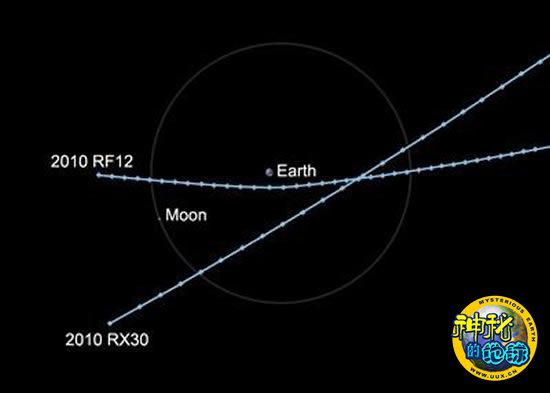 这两颗小行星分别被命名为“2010 RX30”和“2010 RF12”, 2010 RX30小行星直径为10-20米,于北京时间9月8日17点51分达到近地点,此时与地球距离0.6个地球-月球距离,相当于248000公里;2010 RF12小行星直径为6-14米,于北京时间9月9日凌晨5点12分到达近地点,此时与地球距离0.2个地球-月球距离,相当于79000公里。