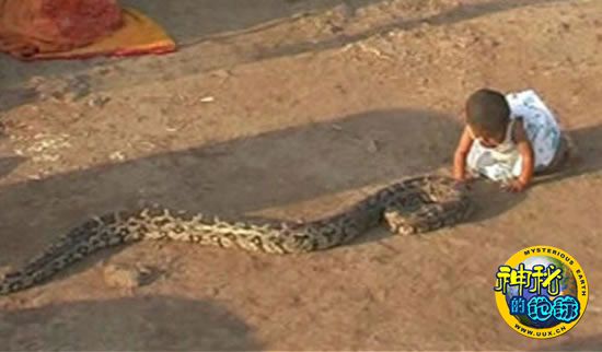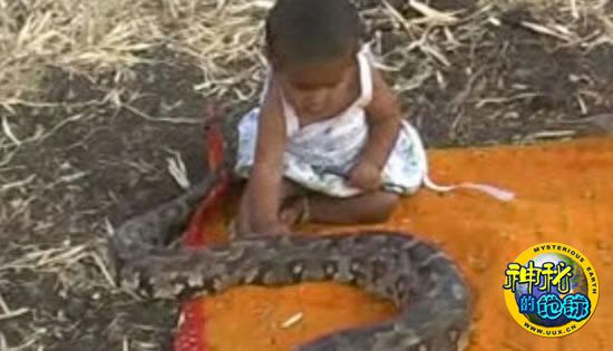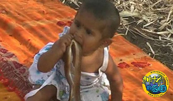 据英国《太阳报》8日报道,印度马哈拉施特拉邦一名6个月大的女婴的父亲是个农民兼捕蛇人,因为没钱买玩具竟然准许女婴将大蟒蛇当玩具,女婴甚至还张嘴咬蟒蛇的尾巴。