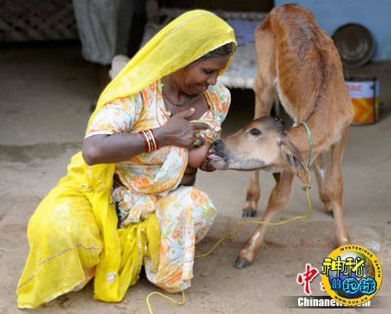 据路透社报道,印度一名47岁的妇女每天给自家的牛犊哺乳数次,在她看来,自母牛不幸丧命之后,她自然而然的担负起照顾小牛的职责。