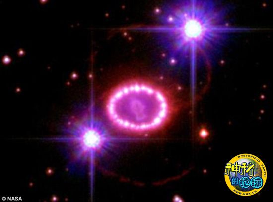 而在超新星释放的冲击波的照亮下,天文学家发现其所环绕的星际物质具有奇特的结构,非常像一串珍珠项链,并可见30颗到40颗“珍珠”。它们应是垂死超大质量恒星在进入超新星状态爆炸前喷射出的宇宙物质,在交互作用下形成环绕着“恒星内脏”的持续发光环状结构。
