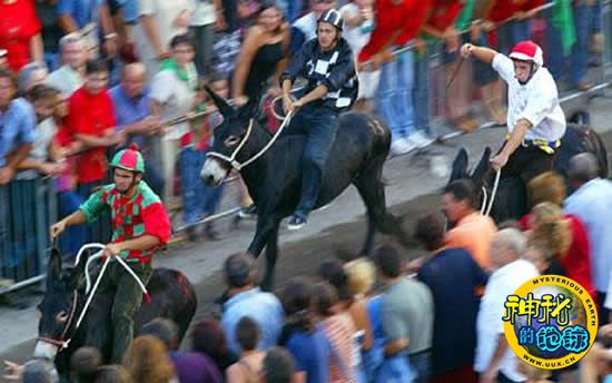 意大利托斯卡那的小城镇每年举办了一项传统赛事,选手们要从8头毛驴中挑选一头作为坐骑,首先跑完4圈的选手可获得胜利。骑驴作为意大利锡耶纳赛马节的一个活动项目,每年都吸引数万名游客参观。