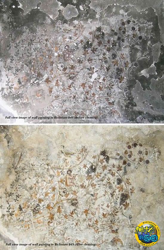 佩特拉郊区一幅展现蔓藤与花朵的石洞壁画对比照,上图为修复前的状态,下图在修复后拍摄。这幅壁画揭示了2000年前绘画者的艺术水准。谢柯德指出,壁画在一个长期被当地贝多因人占据的古代集体用餐区发现,修复前的状况令人堪忧。她说:“石洞内完全被生火时产生的烟灰熏黑和烤焦。里面很多地方被乱涂乱画,墙壁下方是一堆堆山羊粪。”