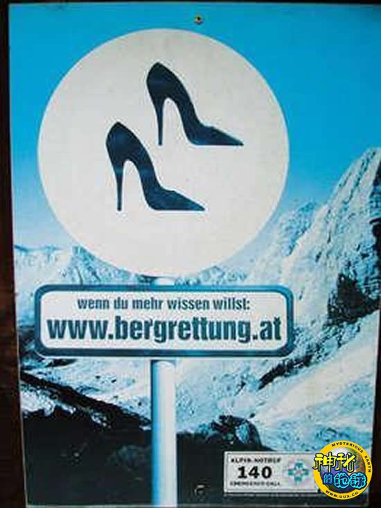 世界各地稀奇古怪的标牌 来源: 蜘蛛网 时间:2010年9月12日 12:37 奥地利Seebachtal,这是建议女士不要穿高跟鞋登山,可是标牌却放在山顶。这不是耍人吗? 上一页12345678 上一篇 下一篇