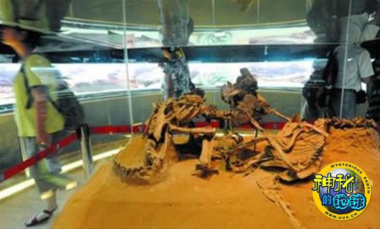 环视整个蒙古馆,最抢眼的要数馆内中央放置的一只巨型恐龙蛋,它有一个独特的名字——“脆弱的蛋体”。走进其中,原来“别有洞天”——巨蛋中间两只恐龙互相扼住对方的咽喉,正在激烈搏斗。据悉,这两具化石出土于蒙古国南部戈壁,分别是蒙古疾走龙和安氏原角龙,被“凝固”前正在进行一场“生死搏斗”。
