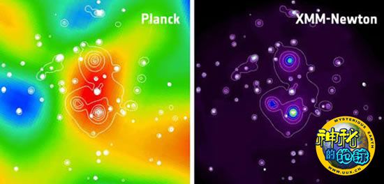 这副图展示了由普朗克和XMM-牛顿(X射线辐射)检测到的超星系团