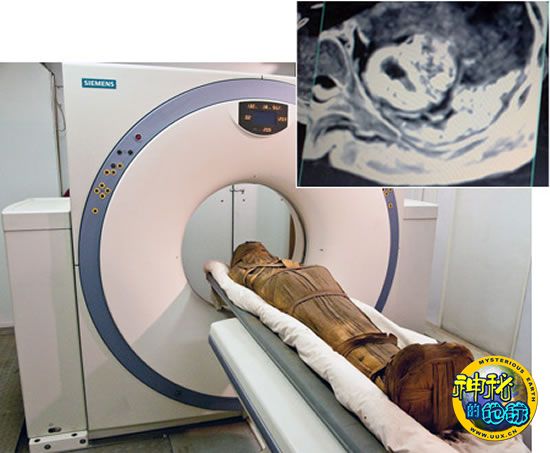 一具即将进行CT扫描的古埃及木乃伊,小图显示的是木乃伊的心脏具有钙沉积物——这正是心脏病的信号。