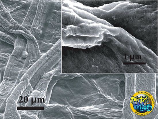 对未曾覆盖的纸纤维的电子显微扫描图像(大图)以及涂上一根碳纳米管后的纤维图像(小图)。