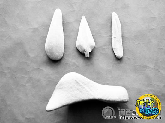 8月30日,陕西博物院的考古专家林教授等人到姑田调研古越岩画。向导谈起此事引起林教授的兴趣。经考古专家鉴定后认为,这几样小怪石分别是石尖、石箭、石刀、石剜,均属旧石器时代晚期石器(如图),距今约有1万年以上至8000年的历史。石尖呈纺锤状尖利器,长9厘米,最宽处3.8厘米。钝尖,两侧如刀刃。石箭呈扁棱箭头,柄断,长6厘米,宽3.6厘米。利尖,两侧锋利如削。石刀上尖下钝,长7.8厘米,宽处1.9厘米。钝尖两侧锋利。石剜尖处呈鸭头状,长13厘米,宽处6.8厘米。鸭头两侧锋利可刺刀剐,握手半圆。