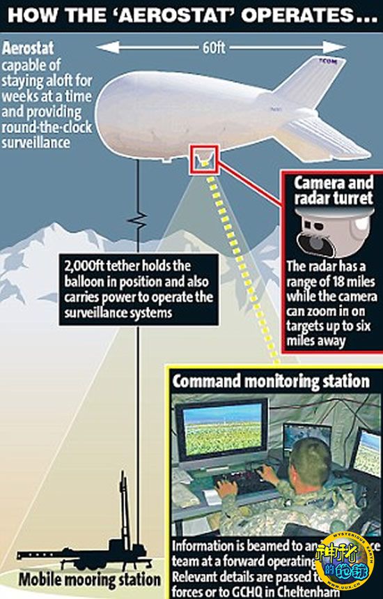 据报道,这种长约60英尺(约合18.3米)的气球造价每个约为500万英镑,被驻阿富汗英国军队放置在高2000英尺(约合610米)的空中,下面栓着钢铁缆绳,将气球固定住,同时通过缆绳将信号传递到电子基站。这种装置能够非常有效地侦测塔利班武装分子的行踪。