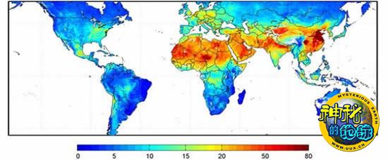 在这张2001-2006年间平均全球空气污染形势图上,全球PM2.5最高的地区在北非和中国的华北、华东、华中全部。世界卫生组织(WHO)认为,PM2.5小于10是安全值,中国的这些地区全部高于50接近80,比撒哈拉沙漠还要高很多。