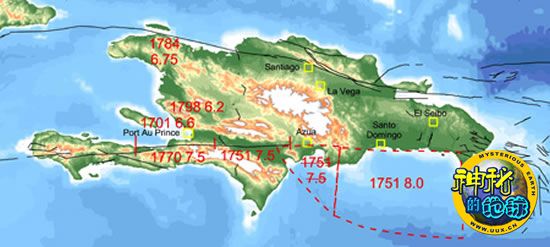 发生在18世纪的地震(红线)袭击了伊斯帕尼奥拉岛。而1月12日发生的海地地震使曾于1770年破裂的断层再度部分断裂(黑线)。