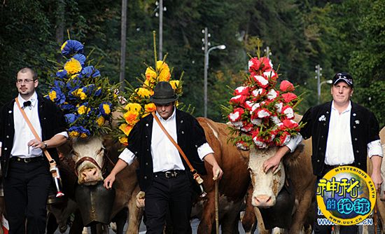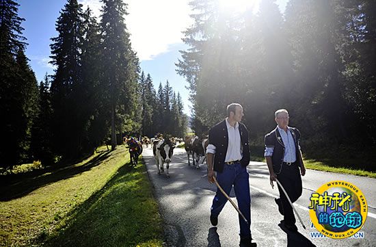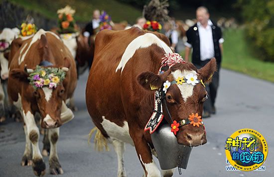 瑞士庆祝赶牛下山 来源: 蜘蛛网 时间:2010年10月03日 12:46 10月2日,在瑞士瓦莱州山间小镇莱蒂瓦, 当地居民赶着自家的牛群下山。每年夏季,牛群在海拔2000多米的瑞士山间草场度夏。到了秋初,各地山区放养的牛群便开始下山过冬。赶牛下山是养牛农民的节日,他们穿上传统服装,给自家的牛挂上牛铃花冠、精心打扮。作为沿途村镇的重要节庆活动,这一传统庆典吸引了众多游客从各地赶来观看。 新华社记者于洋摄 上一篇 下一篇 TAG: 瑞士
