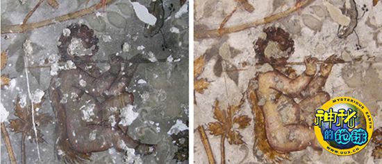 修复前后的洞窟画细部