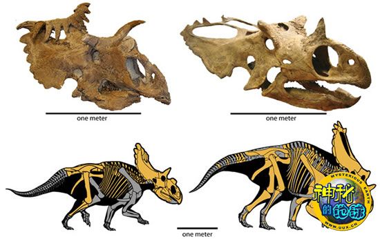 科学家发现了两种三角龙亲戚的化石,它们一定是那个年代里容貌最为出众的生物。两具化石中大一些的被称为犹他龙(Utahceratops gettyi,图中上右及下右),其特征是在鼻子上方生有一支大角,并且在每个眼窝的上方分别向一侧伸出了两个短而圆的角。而这只史前生物2.3米长的头颅即便对于其巨大的接近4米长的身体而言似乎也太大了。而另一只较小的科斯莫角龙(Kosmoceratops richardsoni)也在炫耀着它的“眼角”,包括生长在每个眼窝上方以及向侧面伸出的角,以及一支巨大的鼻角,还有从其头骨骨质皱褶的后部伸出的10多支角。这阵势使得科斯莫角龙成为迄今为止发现的“最有角”的恐龙,之所以这么说并不是没有一定的理由。