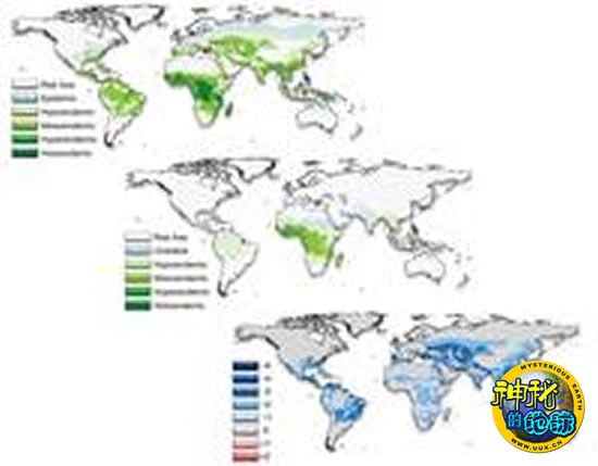1900年的疟疾全球发病区域(上)与近几年的发病区域(中),而发病率增加的地区仅占全球很小的区域(下)。
