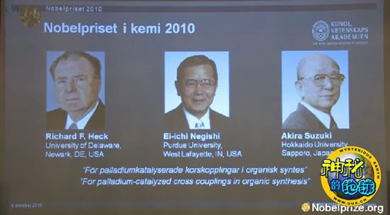 北京时间10月6日下午5点45分,2010年诺贝尔化学奖揭晓,美国与日本三位科学家理查德·海克(Richard F. Heck),根岸英一(Ei-ichi Negishi)及铃木章(Akira Suzuki)分享该奖。获奖理由是“有机合成中钯催化交叉偶联”研究。