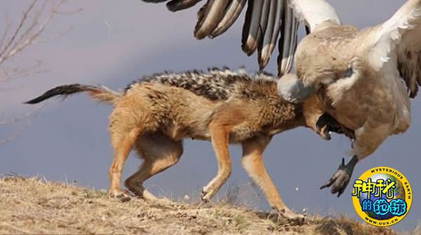 面对强大的对手,饥肠辘辘的豺没有丝毫退缩,奋力发起还击,迫使秃鹫悻悻地飞走了
