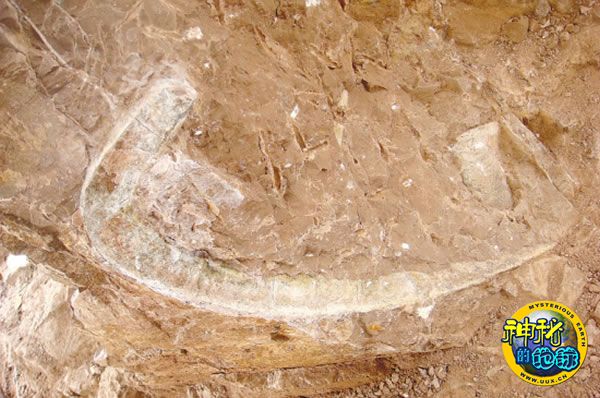 埋在山体中的甲龙肋骨化石