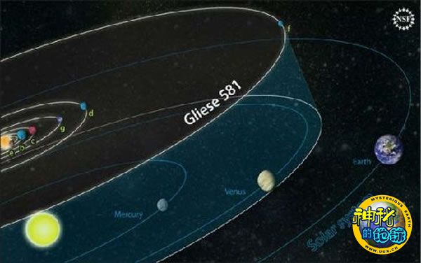 “Gliese 581”星系中的行星轨道与太阳系的行星轨道对比图。“Gliese 581”质量只有太阳质量的30%左右,它的最外层行星与“Gliese 581”的距离比地球与太阳的距离要近。