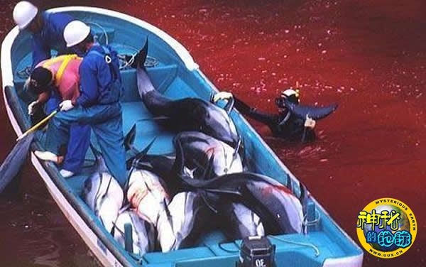 虽然《海豚湾》这部电影已经上映,但日本“太地町”村在今年的10月11日,仍进行着围捕海豚的“传统”活动。12日,渔民将2头长相漂亮的海豚出售给海洋馆,放生了6头幼小的宽吻海豚,然后将剩下的海豚全部勾到渔船边杀死。海湾的水被鲜血染红。