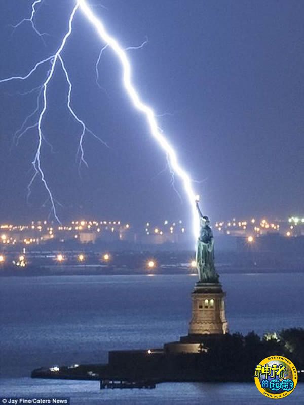 自1886年落成之后,自由女神每年被闪电击中约600次。自由女神由巨大的铜片制成,高305英尺(93米)。