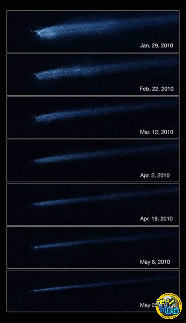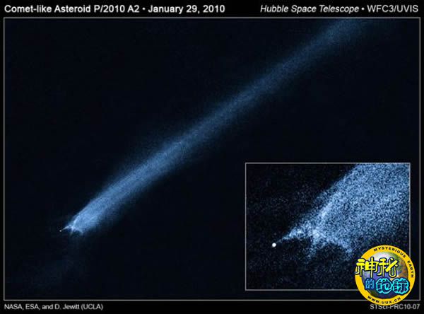 哈勃太空望远镜2010年1月至5月拍摄的一组照片,呈现了小行星相撞后的景象。照片中的天体就是P/2010 A2。两颗相撞的小行星形成了这个有X形核的怪异天体。