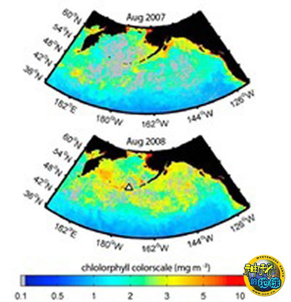 直到2008年8月,北太平洋与加拿大和阿留申群岛交界的一处面积达200万平方公里的海域上才发生了这么一起典型案例。巧的是,这个地方恰好是世界上研究最为充分的海域之一,有关浮游生物的数据可以追溯到50多年前。到了月中,一件令人惊奇的事情发生了。这里的浮游生物数量突然开始大爆发,短短几天内海水里的叶绿素含量就增长了150%。