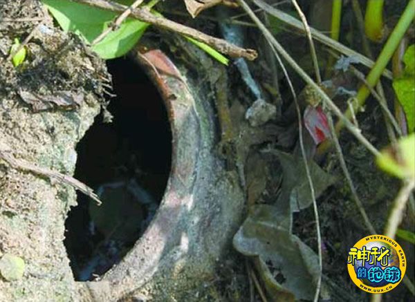 杂草丛中赫然藏着一个陶瓮,瓮口露出了四分之一