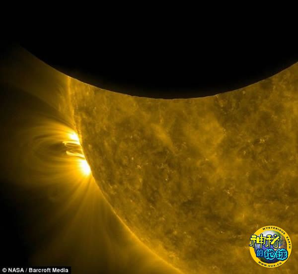 美国宇航局的“太阳动力学天文台”(SDO)正在从远紫外线波长范围内观察太阳,这时黑色的月球开始从它前面越过。从该图可以看到,卷须状的超热等离子体(即已知的太阳耀斑)伸向遥远的太空。像这样的等离子环(Plasma loops)的温度最高可达2000万摄氏度。向图片左侧奔去的等离子环的直径大约是86万英里(138.40万公里)。