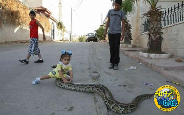 在巴勒斯坦的拉马拉,记者意外的拍摄到一张照片,一位蛇收藏家2岁大的女儿正骑着巨大的缅甸蟒蛇在路边嬉戏。