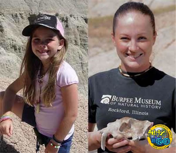 年仅7岁的化石爱好者Kylie(左),科研人员Householder(右)手捧着新发现的剑齿虎化石。