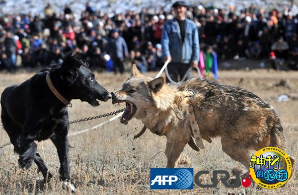 在狩猎节上,一只铁链拴着的狼正在向一条猎狗发动攻击,巴肯巴耶沃村距离吉尔吉斯斯坦首都比什凯克约250公里。
