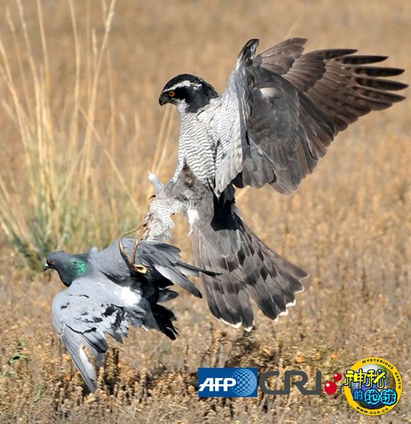 一只猎鹰正在捕捉自己的猎物——一只鸽子。