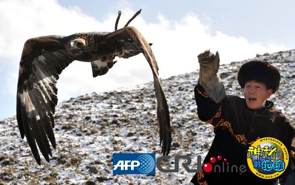 一名鹰猎人将自己的金猎鹰放出捕食。