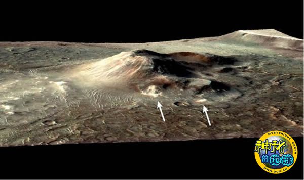 火星上的尼里·帕特拉火山口里的这座火山锥的南侧和附近区域拥有热液矿床,这暗示出它可能是火星上存在的距离现在最近的可居热点。箭头标出了两个最大的沉积物,火山锥左侧的浅色矿物,就是热液沉积物。