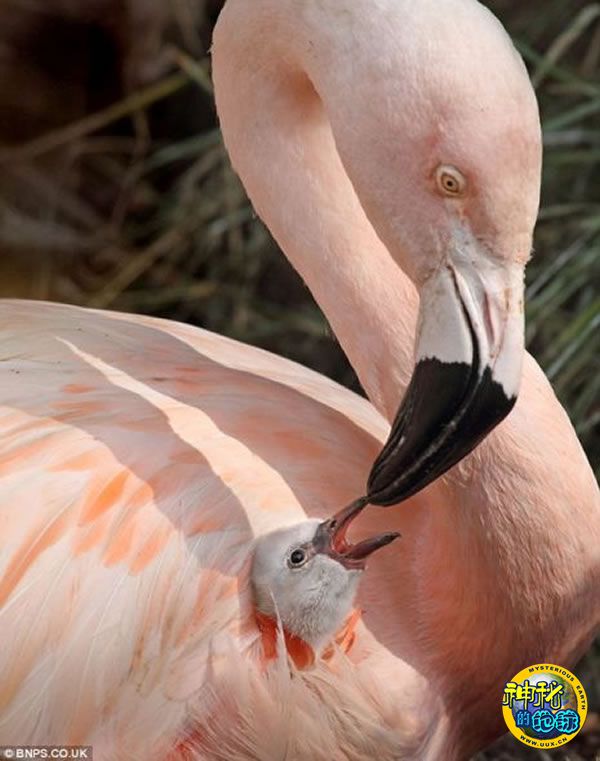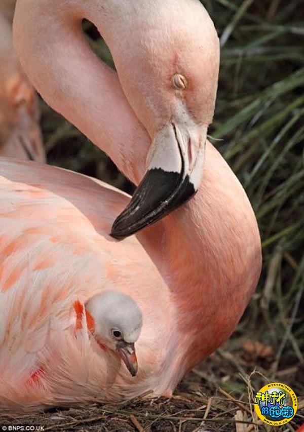 躲在母亲温暖的羽翼下,粉红色的小火烈鸟看上去是那么舒服安逸。