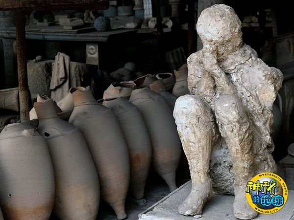 遇难者尸体在火山灰和浮石中行成空腔,考古学家在其中灌注石膏,铸造出了大部分受害者的身形,以此呈现他们死前最后的挣扎模样。如图是其中一尊经典的死难者模型,蜷缩着跪在地上,双手掩面,我们可以想见世界末日突然降临时他脸上狰狞扭曲的表情。