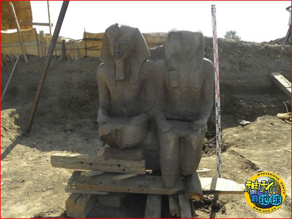 Z.Hawass博士等人发现了有极大权力的埃及法老和鹰头太阳神瑞-赫拉克提的双人塑像的上半部。